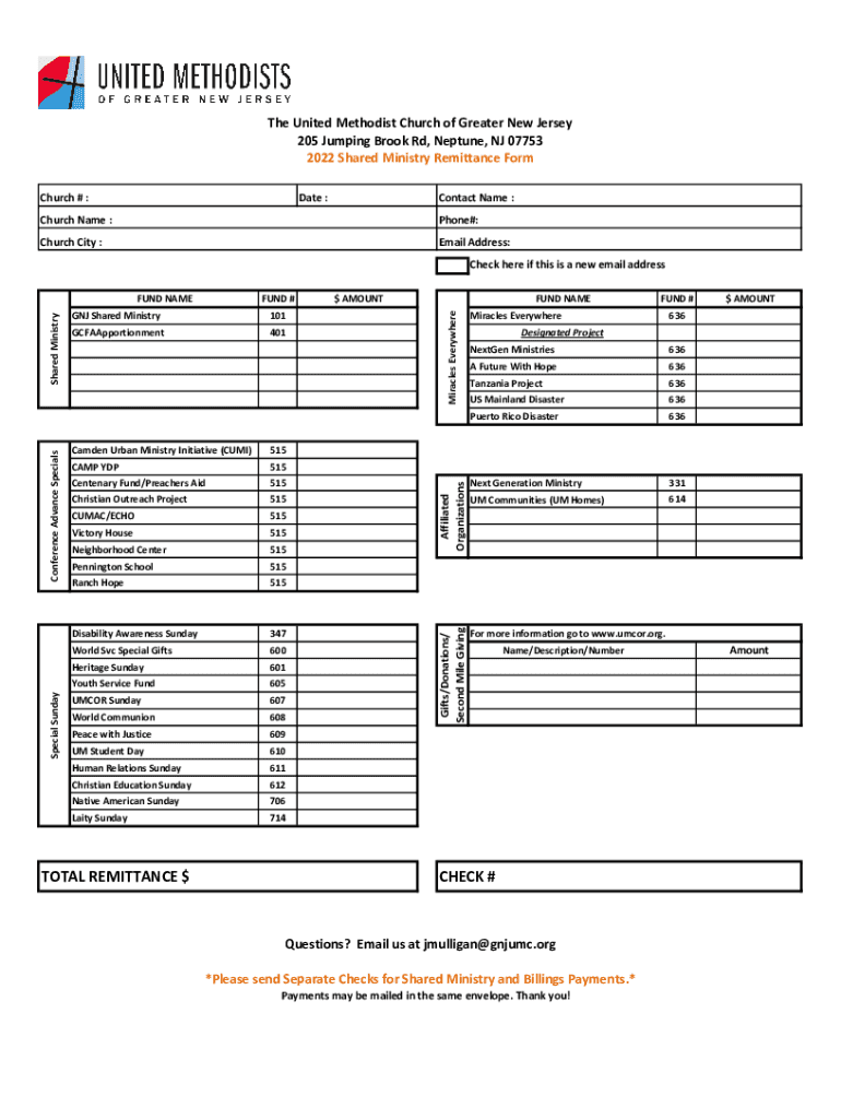 The United Methodist Church of Greater New Jersey 205 Jumping Brook Rd, Neptune, NJ 07753 2022 Shared Ministry Remittance Form Church # :Date :Contact Name :Church Name :Phone#:Church City :Email