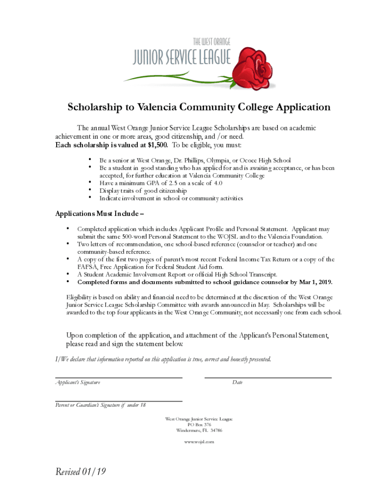 Scholarship to Valencia Community College Application The annual West Orange Junior Service League Scholarships are based on academic achievement in one or more areas, good citizenship, and /or need.
