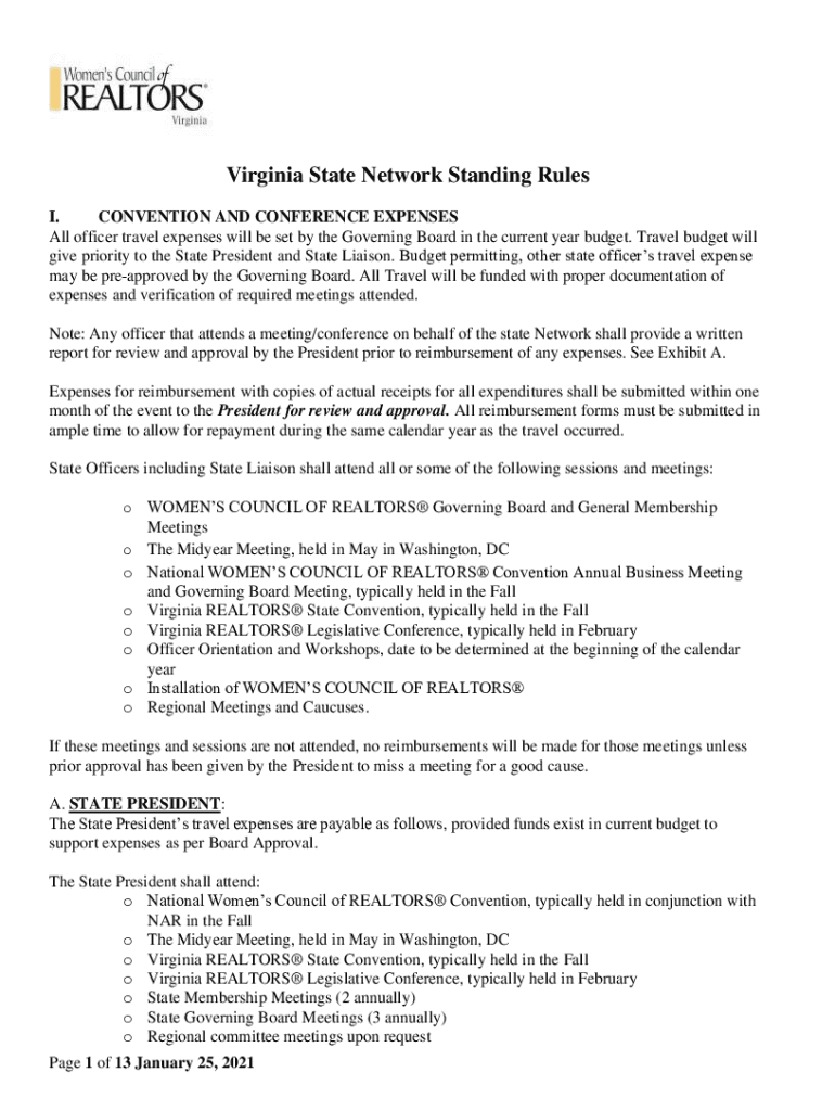 Virginia State Network Standing Rules I. CONVENTION AND CONFERENCE EXPENSES All officer travel expenses will be set by the Governing Board in the current year budget. Travel budget will give priority