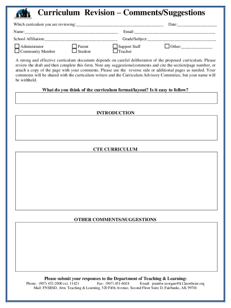 Curriculum Revision Comments/Suggestions Which curriculum you are reviewing:___Date:___Name:___Email:___School Affiliation:___Grade/Subject:___Administrator Community MemberParent StudentSupport Staff