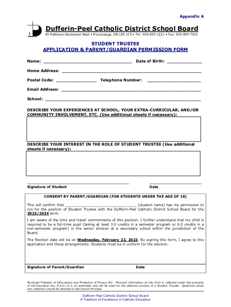 Appendix ADufferinPeel Catholic District School Board40 Matheson Boulevard West Mississauga, ON L5R 1C5 Tel: 9058901221 Fax: 9058907610STUDENT TRUSTEE APPLICATION & PARENT/GUARDIAN PERMISSION FORM