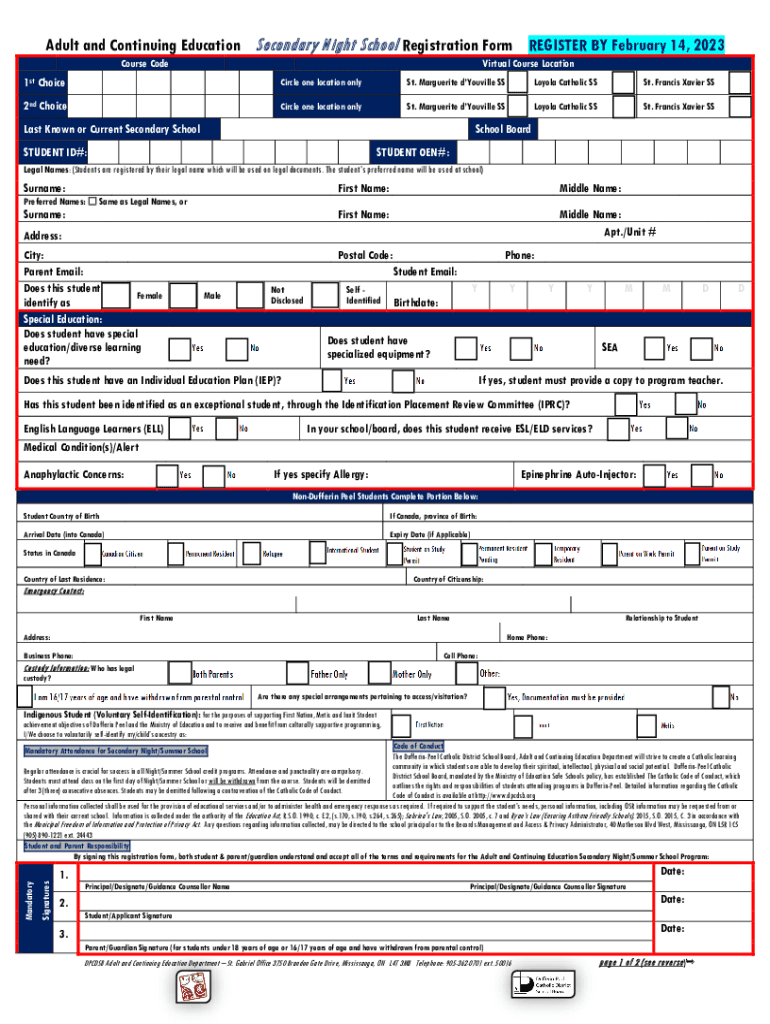 Adult and Continuing Education Secondary Night School Registration Form Registers BY February 14, 2023,