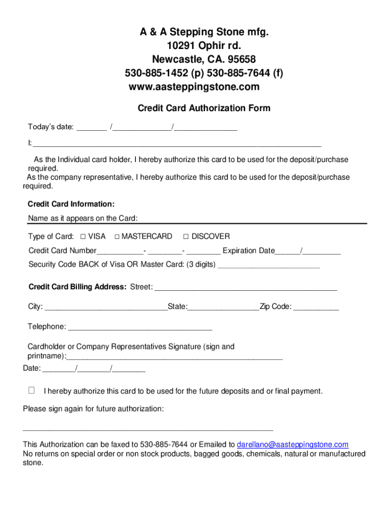A & A Stepping Stone mfg. 10291 Ophir rd. Newcastle, CA. 95658 5308851452 (p) 5308857644 (f) www.aasteppingstone.com Credit Card Authorization Form Today's date: ___ /___/___ I: ___ As the Individual