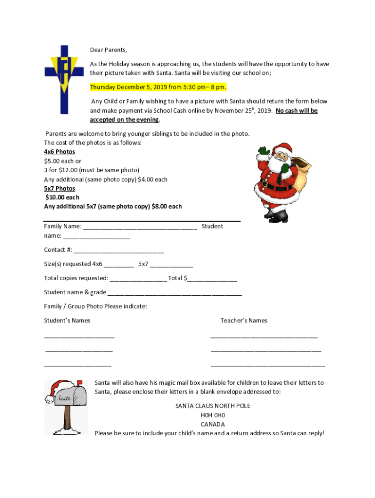 Dear Parents, As the Holiday season is approaching us, the students will have the opportunity to have their picture taken with Santa. Santa will be visiting our school on; Thursday, December 5, 2019,