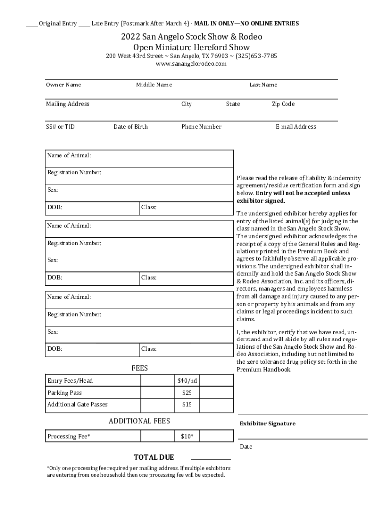 ___ Original Entry ___ Late Entry (Postmark After March 4) MAIL IN ONLY NO ONLINE ENTRIES2022 San Angelo Stock Show & Rodeo Open Miniature Hereford Show 200 West 43rd Street San Angelo, TX 76903 (325)6537785