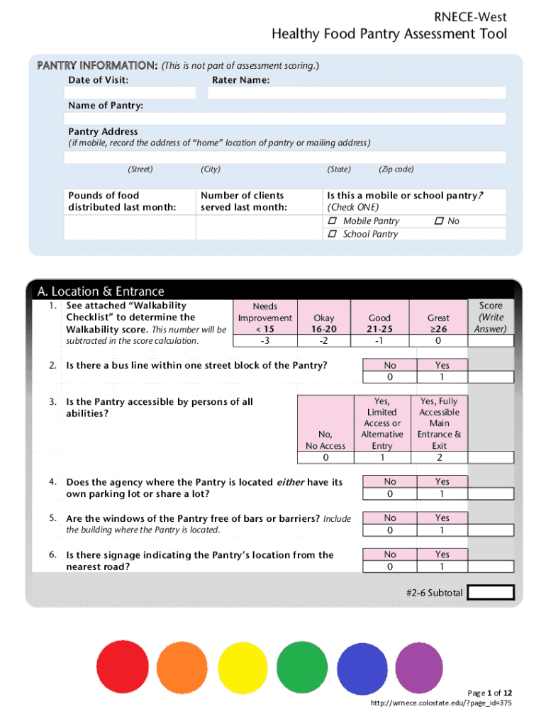 RNECEWestHealthy Food Pantry Assessment Tool PANTRY INFORMATION: (This is not part of assessment scoring.) Date of Visit:Rater Name:Name of Pantry: Pantry Address(if mobile, record the address of