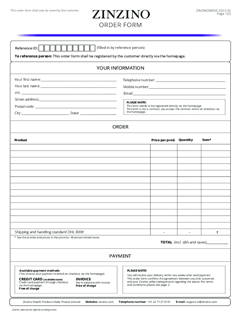 ZINZINOINDIA 202202-Page 1(2)This order form shall only be saved by the customer. ORDER FORM(filled in by reference person)Reference ID:To reference person: This order form shall be registered by