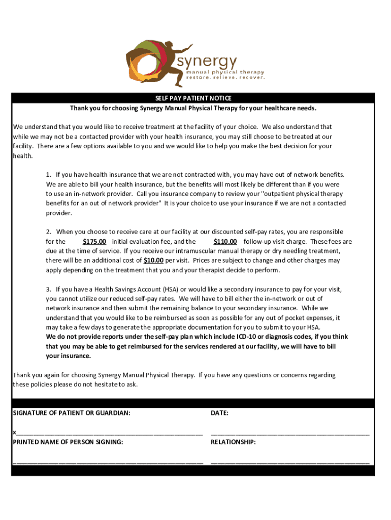 SELF PAY PATIENT NOTICE Thank you for choosing Synergy Manual Physical Therapy for your healthcare needs. We understand that you would like to receive treatment at the facility of your choice. We