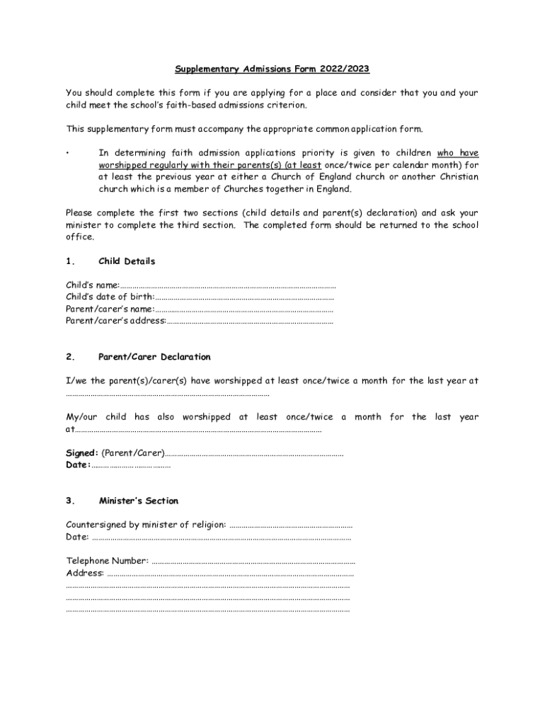 Supplementary Admissions Form 2022/2023 You should complete this form if you are applying for a place and consider that you and your child meet the schools faith based admissions criterion. This supplementary