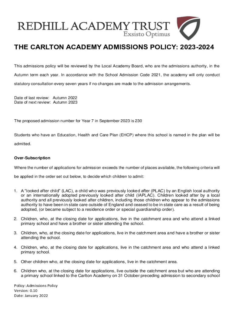 THE CARLTON ACADEMY ADMISSIONS POLICY: 20232024 These admissions' policy will be reviewed by the Local Academy Board, who are the admissions' authority, in the Autumn term each year. In accordance