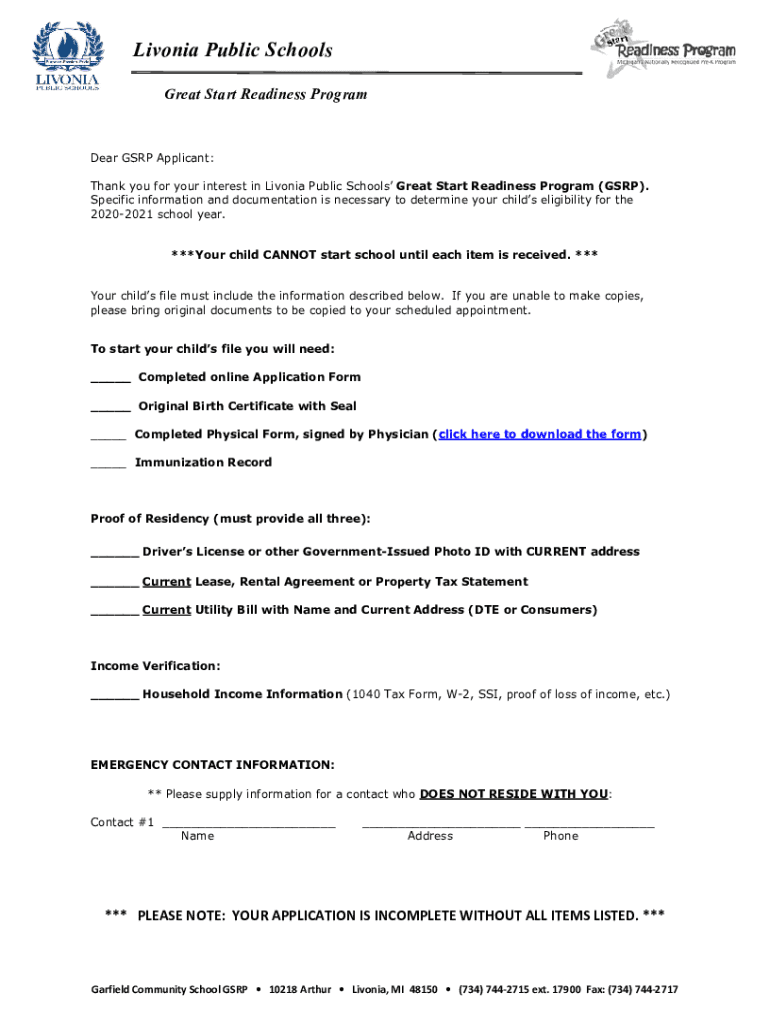 Livonia Public Schools Great Start Readiness Programmer GRP Applicant: Thank you for your interest in Livonia Public Schools Great Start Readiness Program (GRP). Specific information and documentation