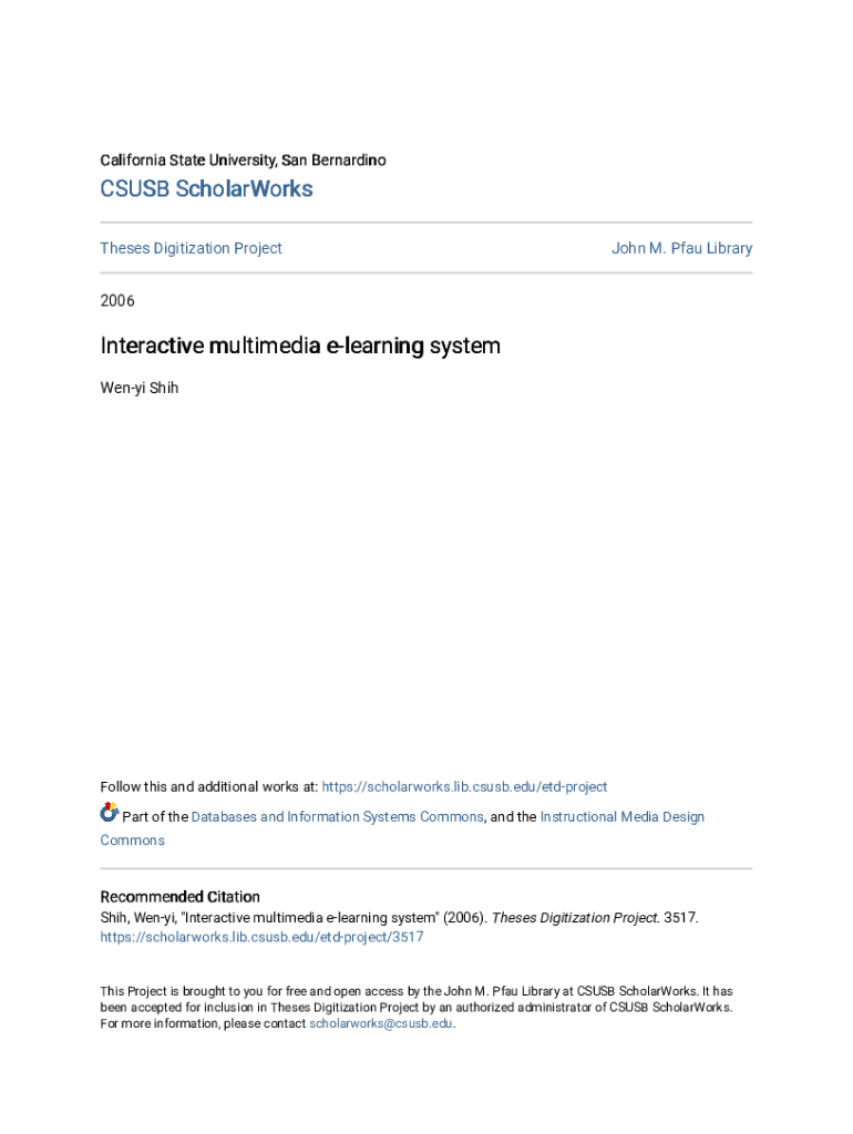 California State University, San BernardinoCSUSB ScholarWorks These Digitization Project John M. PFA Library2006Interactive multimedia e-learning system Wendi ShihFollow this and additional works