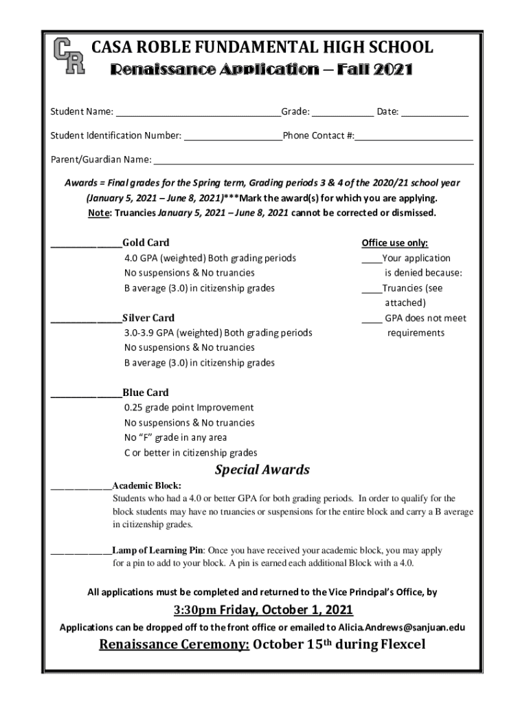 CASA ROLE FUNDAMENTAL HIGH SCHOOL Renaissance Application Fall 2021 Student Name: ___Grade: ___ Date: ___ Student Identification Number: ___Phone Contact #:___ Parent/Guardian Name: ___ Awards Final