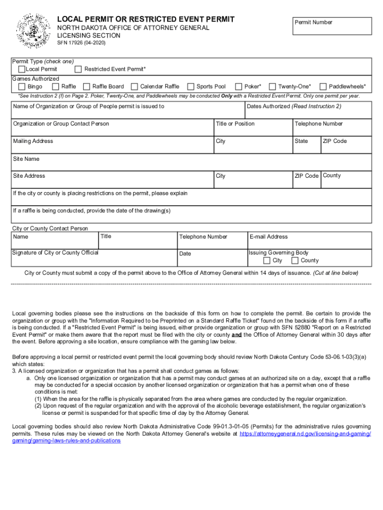 LOCAL PERMIT OR RESTRICTED EVENT PERMITPermit NumberNORTH DAKOTA OFFICE OF ATTORNEY GENERAL