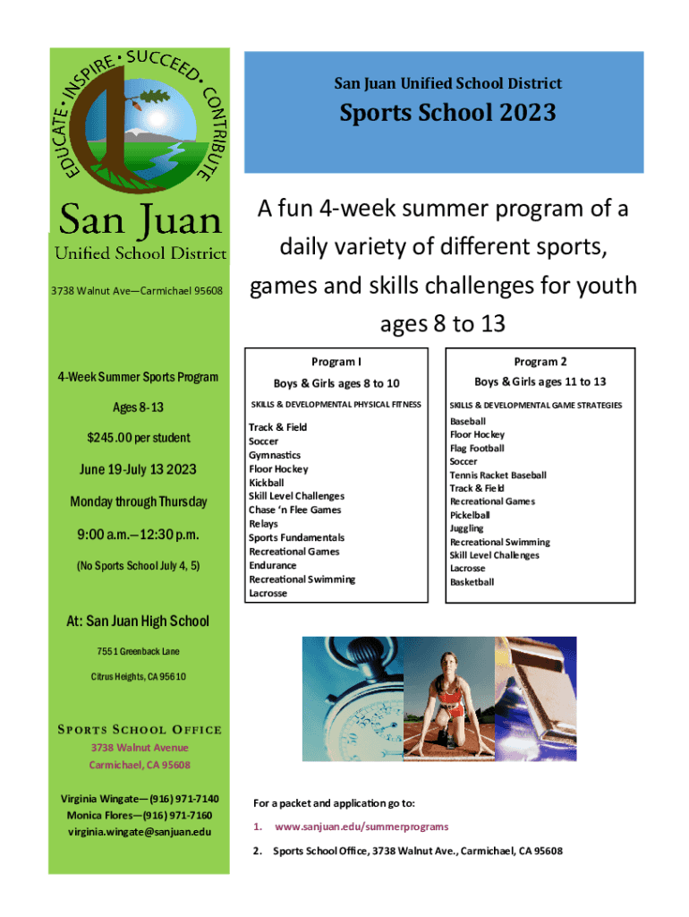 San Juan Uni aid School District Sports School 20233738 Walnut Ave Carmichael 95608A fun 4week summer program of a daily variety of dearest sports, games and skills challenges for youth ages 8 to