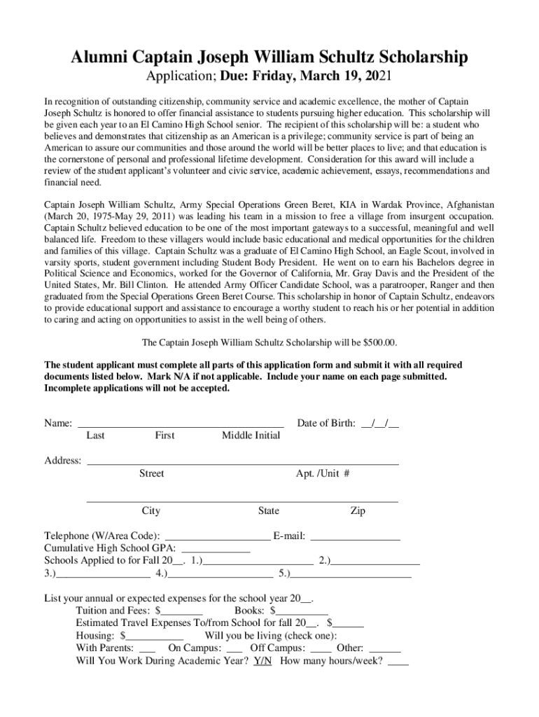 Alumni Captain Joseph William Schultz Scholarship Application; Due: Friday, March 19, 2021In recognition of outstanding citizenship, community service and academic excellence, the mother of Captain