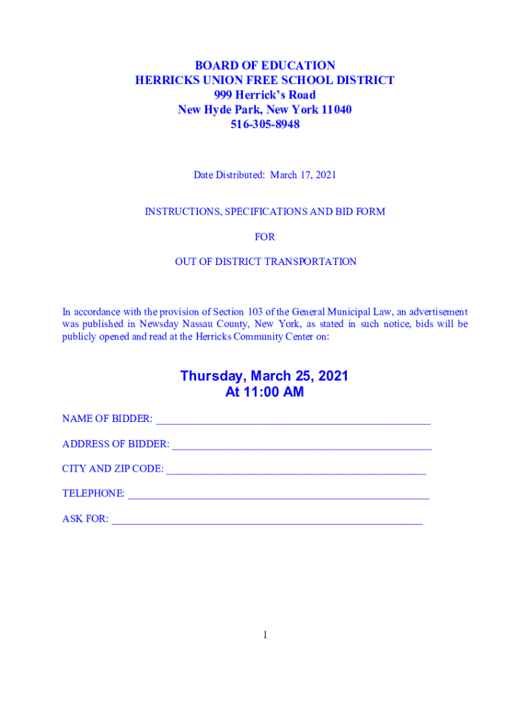 BOARD OF EDUCATION HERRICK UNION FREE SCHOOL DISTRICT 999 Herrick's Road New Hyde Park, New York 11040 5163058948Date Distributed: March 17, 2021, INSTRUCTIONS, SPECIFICATIONS AND BID FORM FOR OUT