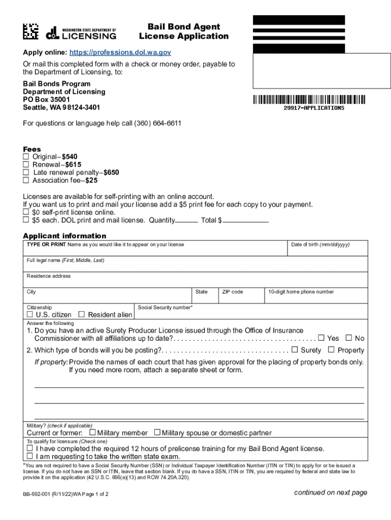 Bail Bond Agent License Application Apply online: https://professions.dol.wa.gov Or mail this completed form with a check or money order, payable to the Department of Licensing, to: Bail Bonds Program