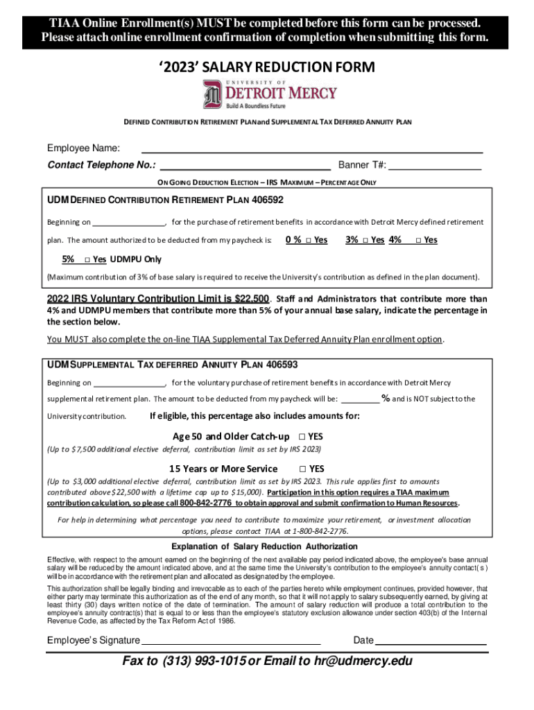 TIAA Online Enrollment(s) MUST be completed before this form can be processed. Please attach online enrollment confirmation of completion when submitting this form.2023 SALARY REDUCTION REDEFINED