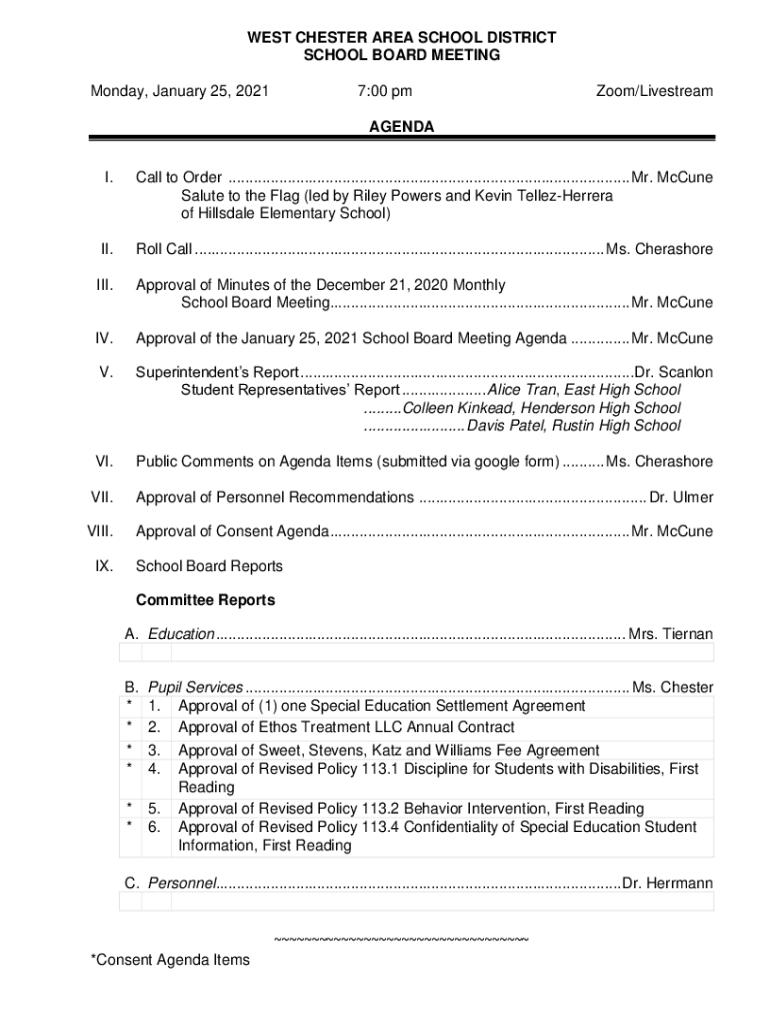 WEST CHESTER AREA SCHOOL DISTRICT SCHOOL BOARD MEETING Monday, January 25, 20217:00 pm Zoom/LivestreamAGENDA I. Call to Order ...............................................................................................