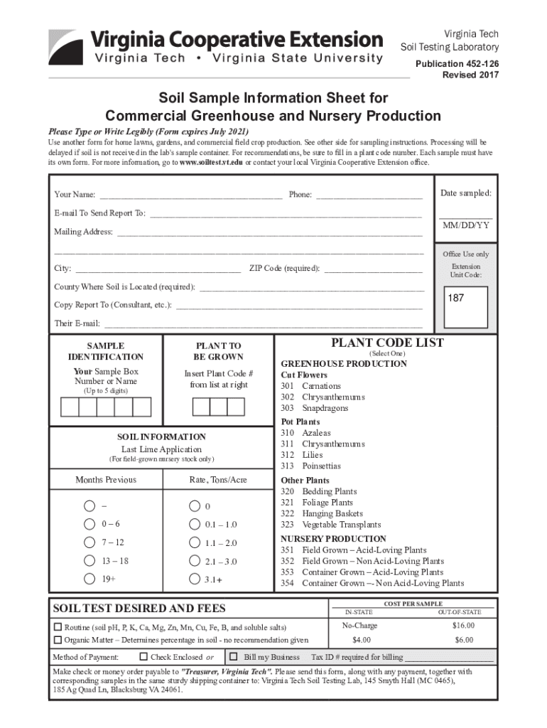 Virginia Tech Soil Testing Laboratory Publication 452126 Revised 2017Soil Sample Information Sheet for Commercial Greenhouse and Nursery ProductionPlease Type or Write Legibly (Form expires July 2021)Use