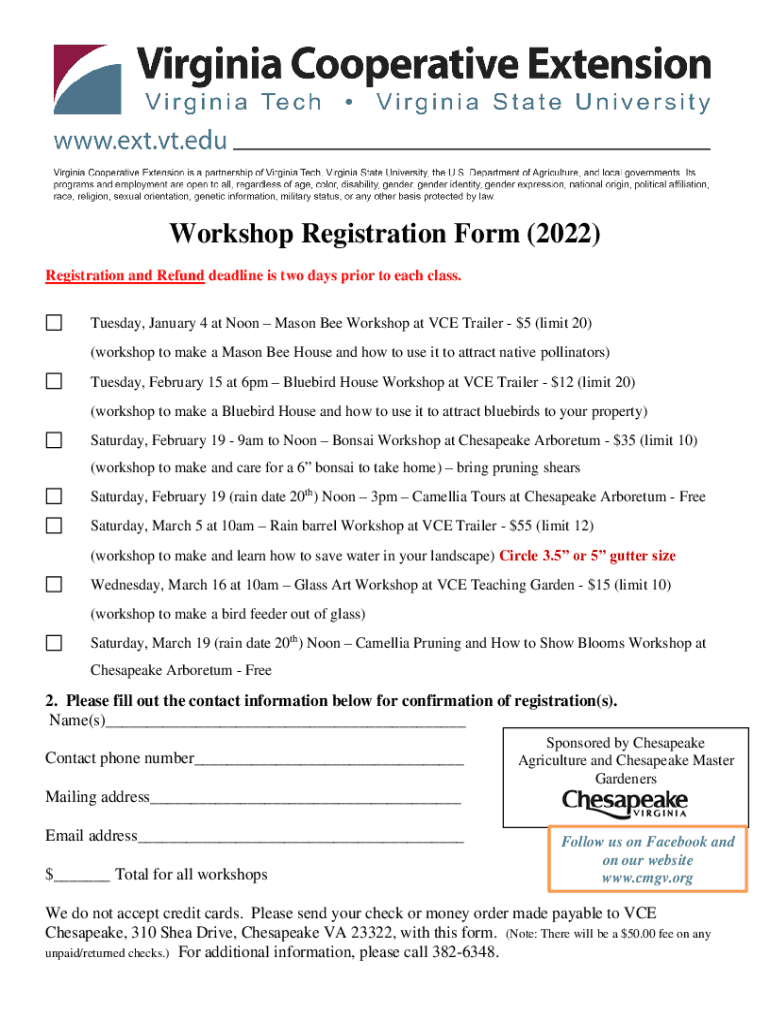 Workshop Registration Form (2022) Registration and Refund deadline is two days prior to each class. Tuesday, January 4 at Noon Mason Bee Workshop at ICE Trailer $5 (limit 20) (workshop to make a Mason