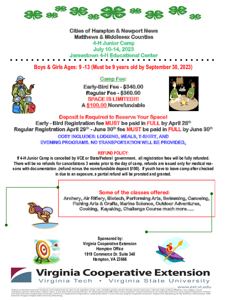 Cities of Hampton & Newport News Matthews & Middlesex Counties 4H Junior Camp July 1014, 2023 Jamestown 4H Educational Centers & Girls Ages: 9 13 (Must be 9 years old by September 30, 2023) Camp Fee: