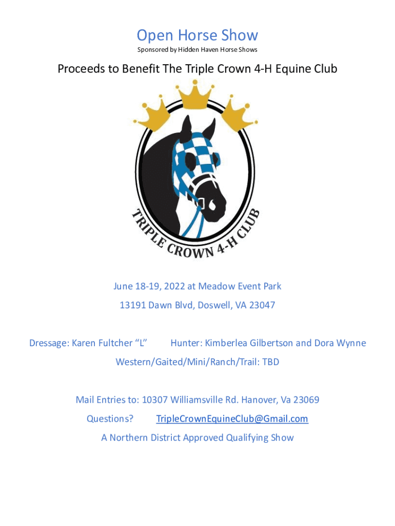 Sponsored by Hidden Haven Horse ShowsProceeds to Benefit The Triple Crown 4H Equine Club June 1819, 2022 at Meadow Event Park
