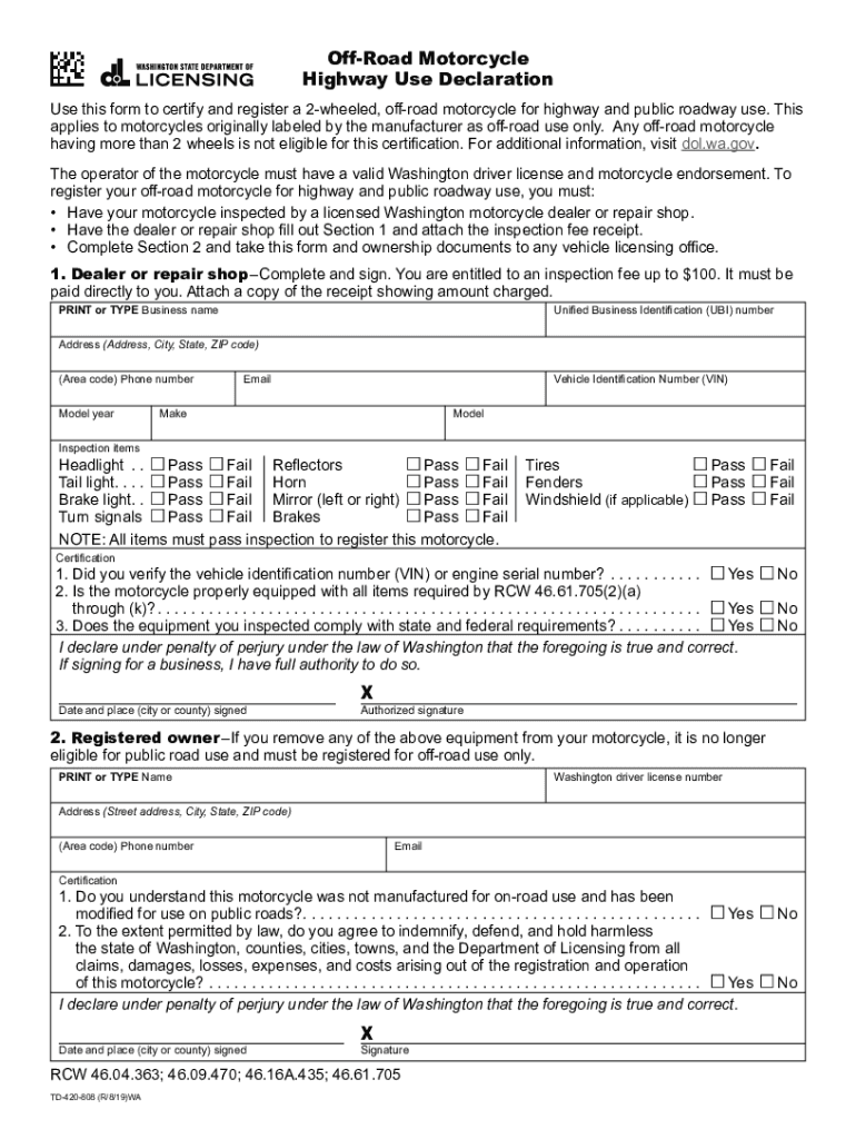 Offload Motorcycle Highway Use Declaration Use this form to certify and register a 2wheeled, offload motorcycle for highway and public roadway use. This applies to motorcycles originally labeled by