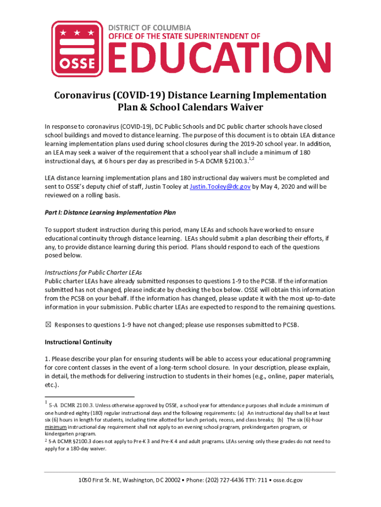 Coronavirus (COVID-19) Distance Learning Implementation Plan & School Calendars Waiver In response to coronavirus (COVID-19), DC Public Schools and DC public charter schools have closed school buildings