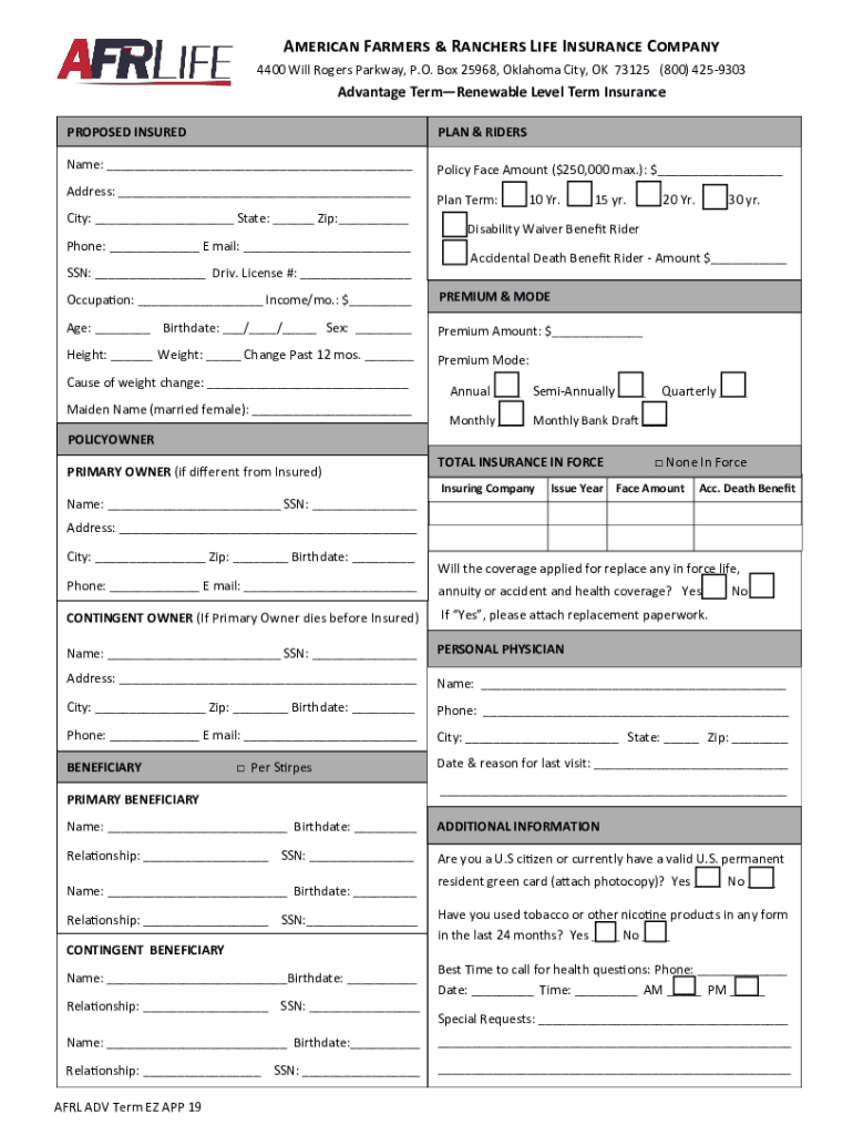 American Farmers & Ranchers Life Insurance Company 4400 Will Rogers Parkway, P.O. Box 25968, Oklahoma City, OK 73125 (800) 4259303Advantage TermRenewable Level Term Insurance PROPOSED INSUREDPLAN