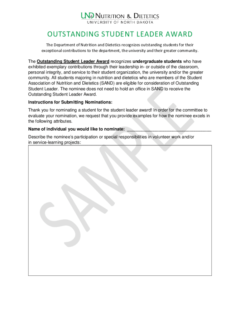 OUTSTANDING STUDENT LEADER AWARD The Department of Nutrition and Dietetics recognizes outstanding students for their exceptional contributions to the department, the university and their greater community.