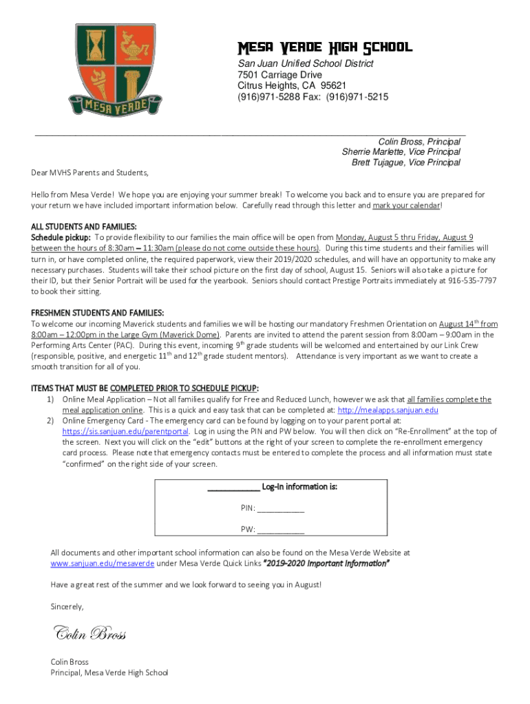 Mesa Verde High School San Juan Unified School District 7501 Carriage Drive Citrus Heights, CA 95621 (916)9715288 Fax: (916)9715215___ Colin Cross, Principal Sherrie Marlette, Vice Principal Brett