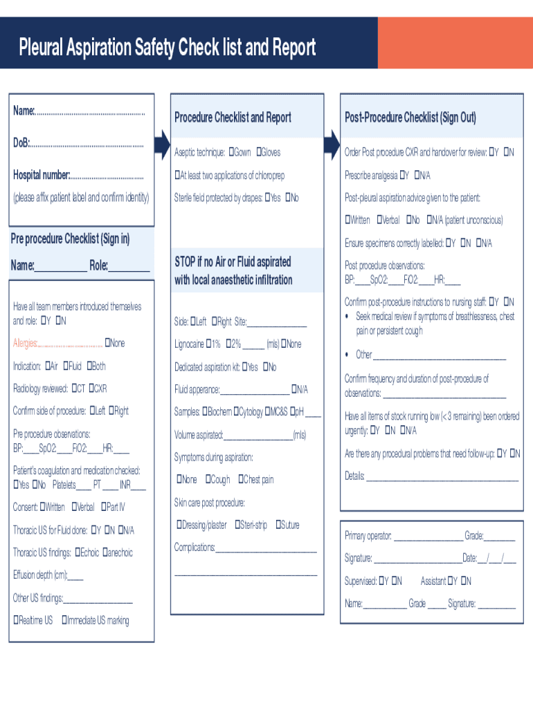 Pleural Aspiration Safety Check list and Report Name:......................................................... Procedure Checklist and ReportPostProcedure Checklist (Sign Out)Aseptic technique: gown