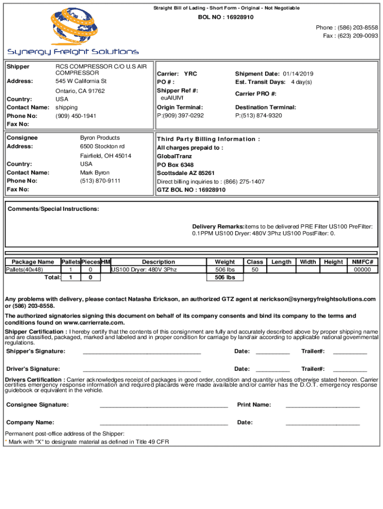 Straight Bill of Lading Short Form Original Not Negotiable NO : 16928910 Phones : (586) 2038558 Fax : (623) 2090093ShipperCarrier: Reshipment Date: 01/14/2019Address:RCS COMPRESSOR C/O U.S. AIR COMPRESSOR