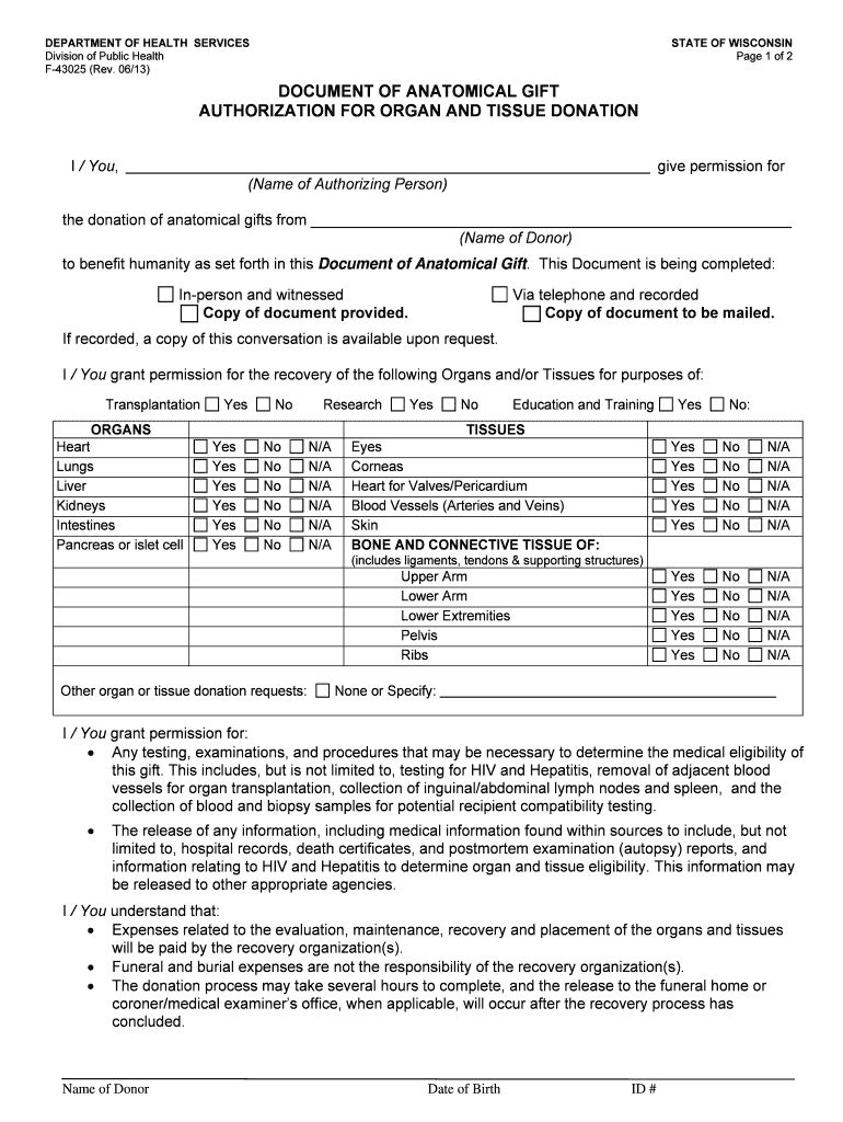 DEPARTMENT OF HEALTH SERVICES Division of Public Health F-43025 (Rev. 06/13) STATE OF WISCONSIN Page 1 of 2 Documents OF ANATOMICAL GIFT AUTHORIZATION FOR ORGAN AND TISSUE DONATION I / You, give permission