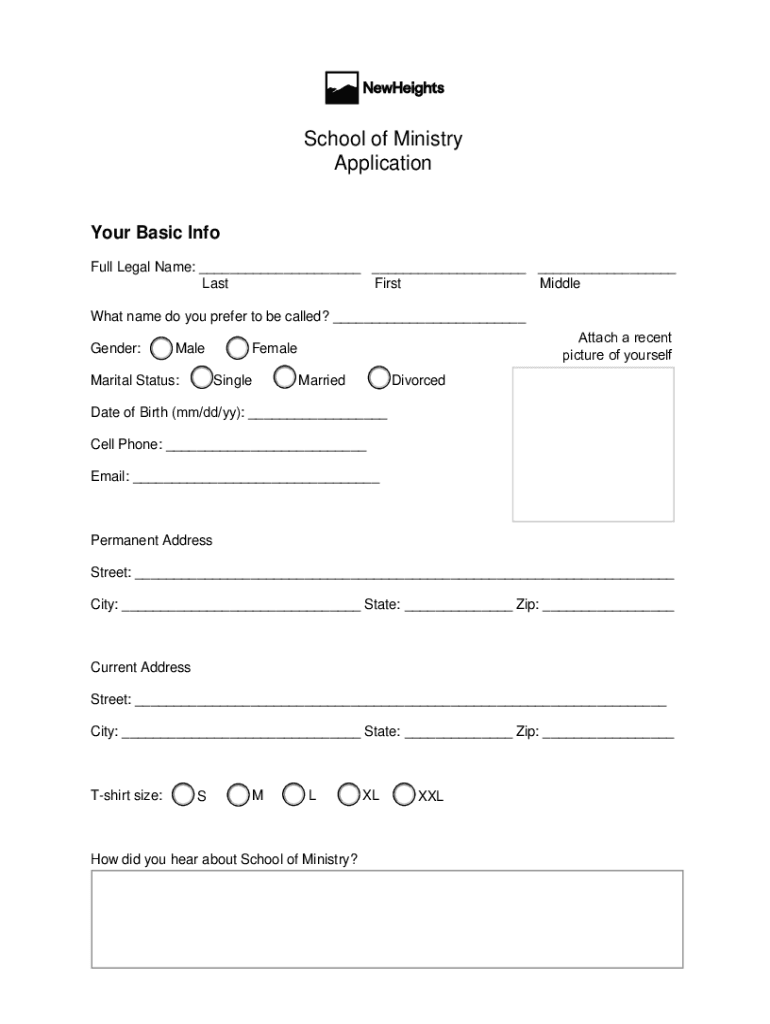 School of Ministry ApplicationYour Basic Info Full Legal Name: ___ ___ ___ First Middle Last What name do you prefer to be called? ___ Gender:Malarial Status:Attach a recent picture of yourselfFemale