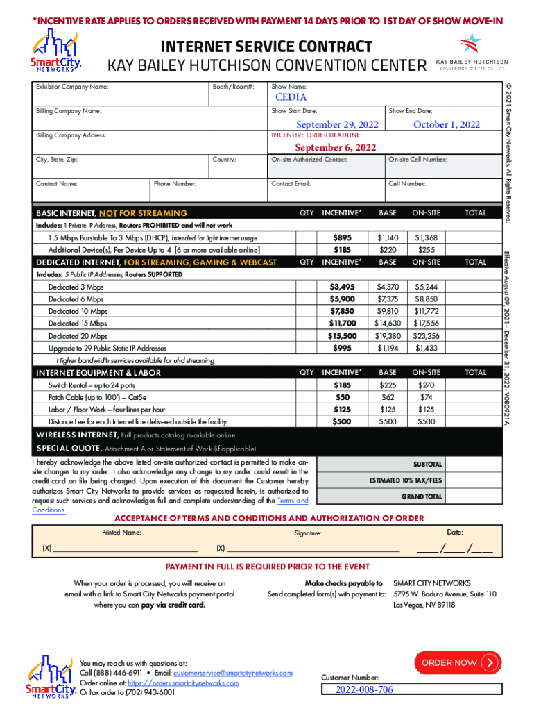*INCENTIVE RATE APPLIES TO ORDERS RECEIVED WITH PAYMENT 14 DAYS PRIOR TO 1ST DAY OF SHOW MOVEININTERNET SERVICE CONTRACT KAY BAILEY HUTCHISON CONVENTION CENTER Booth/Room#:Show Name:CEDIABilling Company