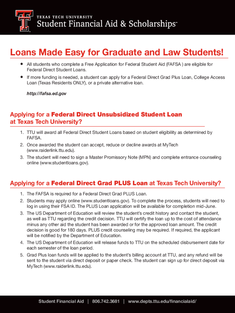 Loans Made Easy for Graduate and Law Students! ___ All students who complete a Free Application for Federal Student Aid (FAFSA) are eligible for Federal Direct Student Loans. If more funding is needed,