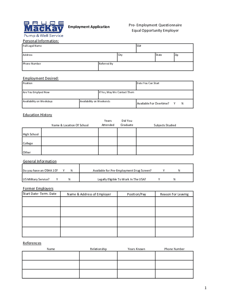 Pre employment questionnaire equal is a form used by employers to gather information about job applicants' background, qualifications, and personal details.