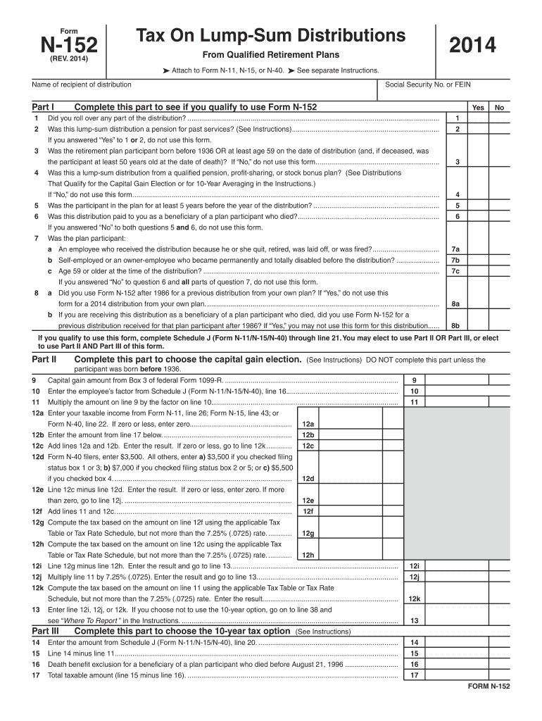 Clear Form (REV. 2014) N-152 Tax On Lump-Sum Distributions Attach to Form N-11, N-15, or N-40. See separate Instructions. Name of recipient of distribution Part I 2014 From Qualified Retirement Plans