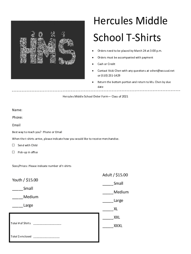 Hercules Middle School Shirts Orders need to be placed by March 24 at 3:00 p.m. Orders must be accompanied by payment Cash or CreditContact Vicki Chen with any questions at vchen@wccusd.net or (510)