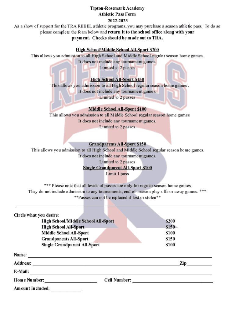 TiptonRosemark Academy Athletic Pass Form 20212022 20222023 As a show of support for the ERA REBEL athletic programs, you may purchase a season athletic pass. To do so please complete the form below