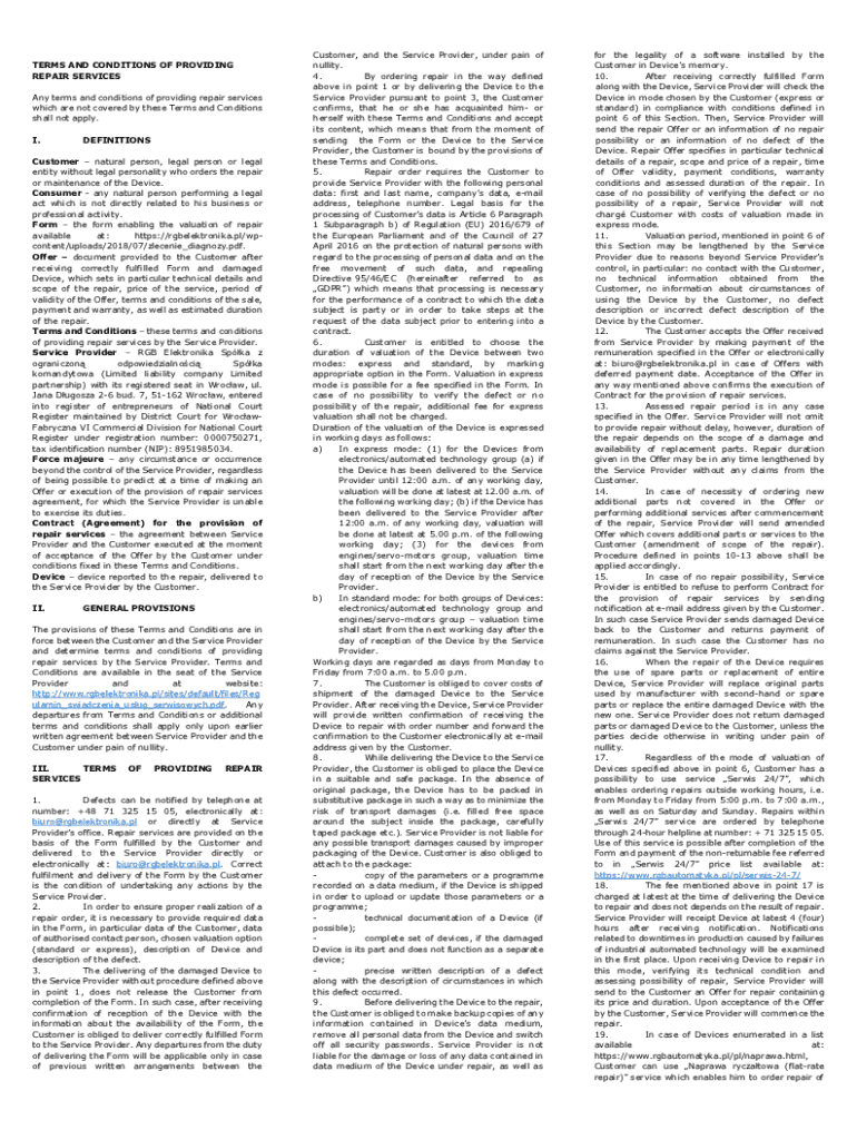 TERMS AND CONDITIONS OF PROVIDING REPAIR SERVICES Any terms and conditions of providing repair services which are not covered by these Terms and Conditions shall not apply. I.DEFINITIONSCustomer natural