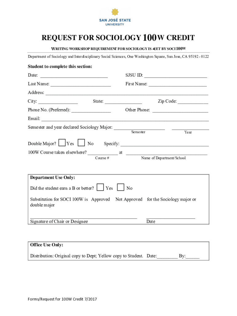 REQUEST FOR SOCIOLOGY 100 W CREDIT W WRITING WORKSHOP REQUIREMENT FOR SOCIOLOGY IS 0ET BY SCI 100W Department of Sociology and Interdisciplinary Social Sciences, One Washington Square, San Jose, CA