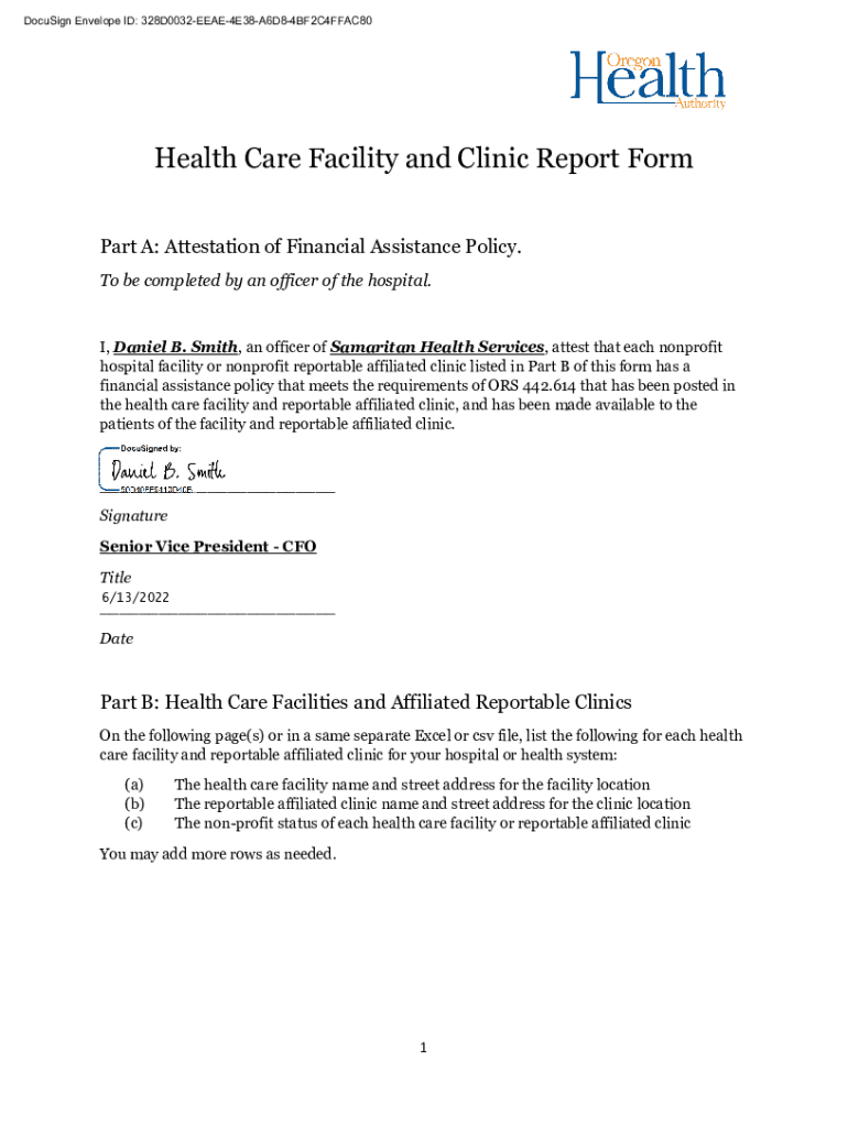 DocuSign Envelope ID: 328D0032EEAE4E38A6D84BF2C4FFAC80Health Care Facility and Clinic Report Form Part A: Attestation of Financial Assistance Policy. To be completed by an officer of the hospital.