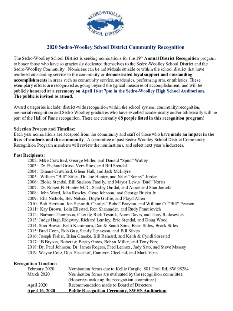2020 SedroWoolley School District Community Recognition The SedroWoolley School District is seeking nominations for the 19th Annual District Recognition program to honor those who have so graciously