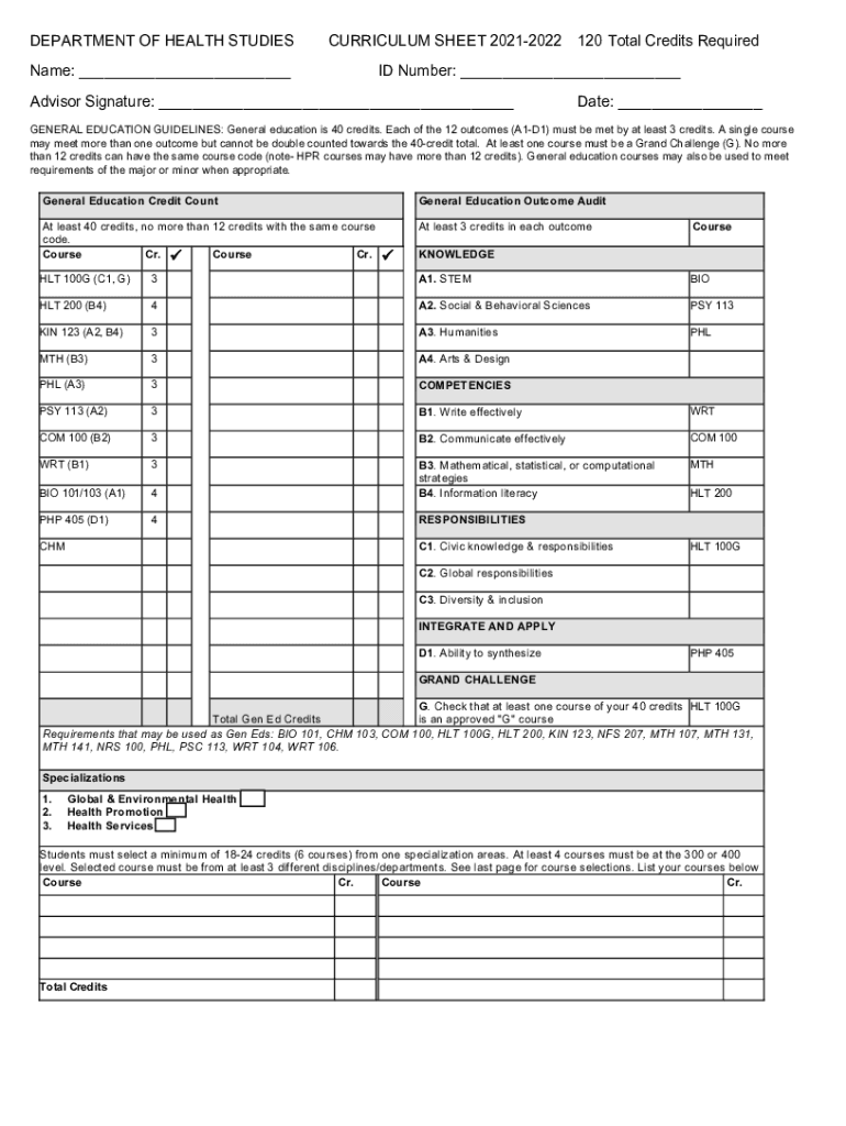 DEPARTMENT OF HEALTH STUDIESCURRICULUM SHEET 20212022 120 Total Credits RequiredName: ___ID Number: ___Advisor Signature: ___Date: ___GENERAL EDUCATION GUIDELINES: General education is 40 credits.