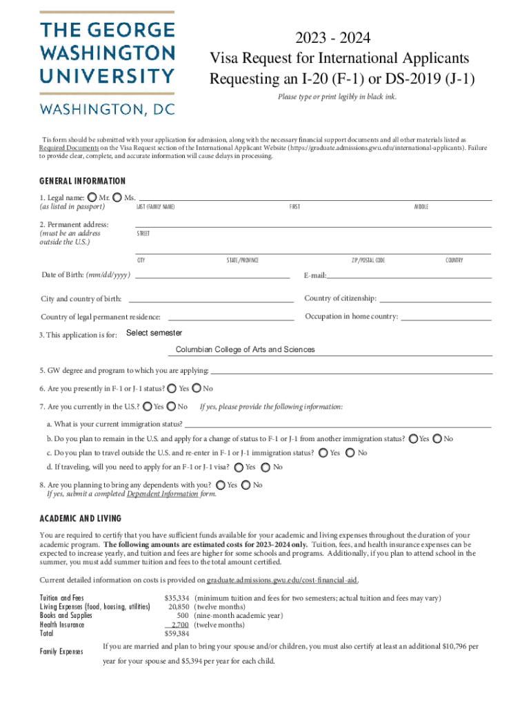 Get the free 2023 - 2024 Visa Request for International Applicants ... - columbian gwu