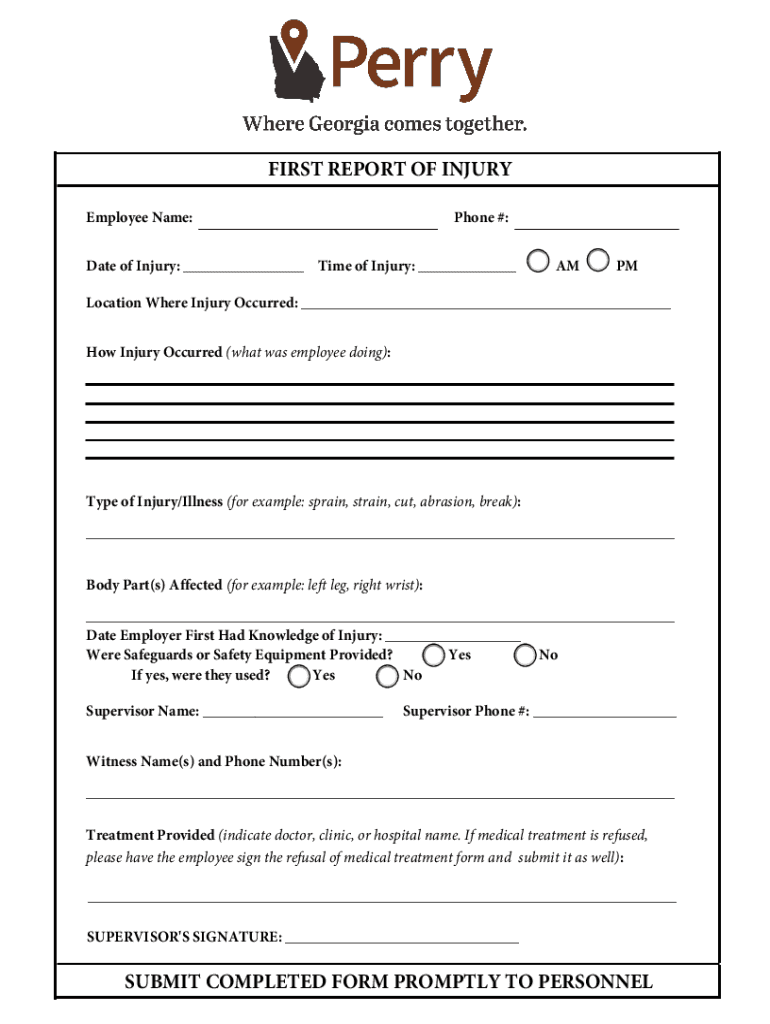 FIRST REPORT OF INJURY Phone #:Employee Name:Date of Injury: ___ Time of Injury: ___Application Where Injury Occurred: ___ How Injury Occurred (what was employee doing):Type of Injury/Illness (for
